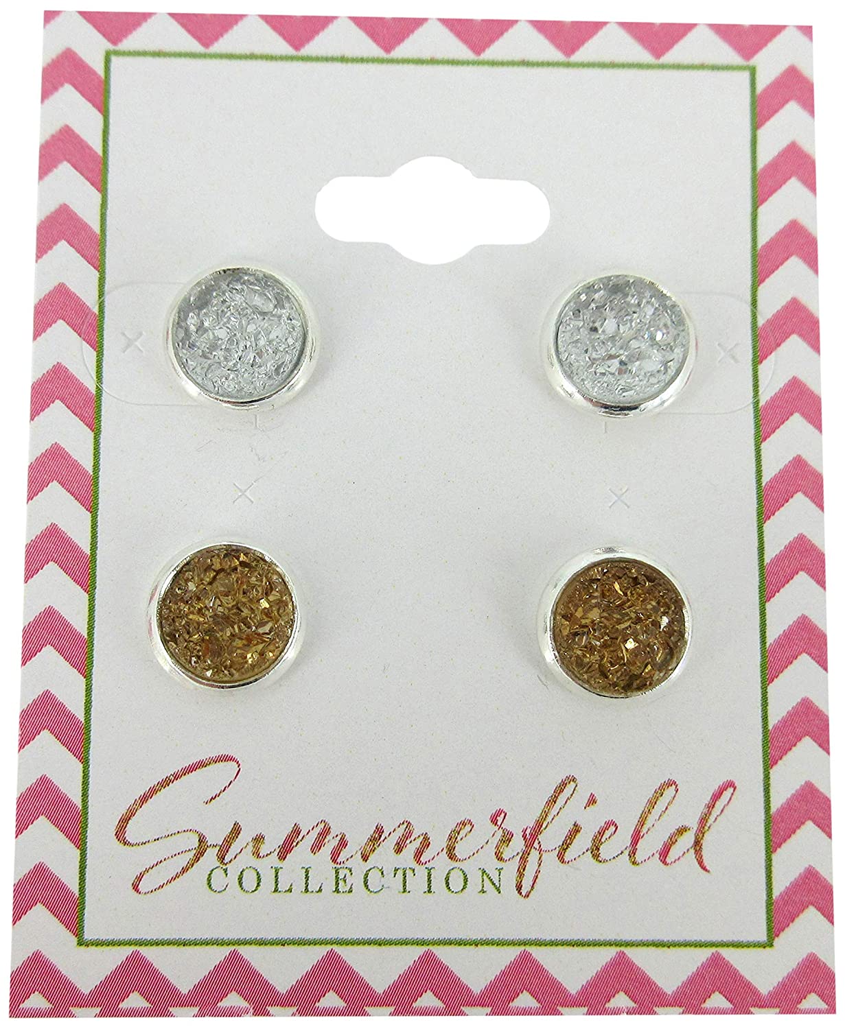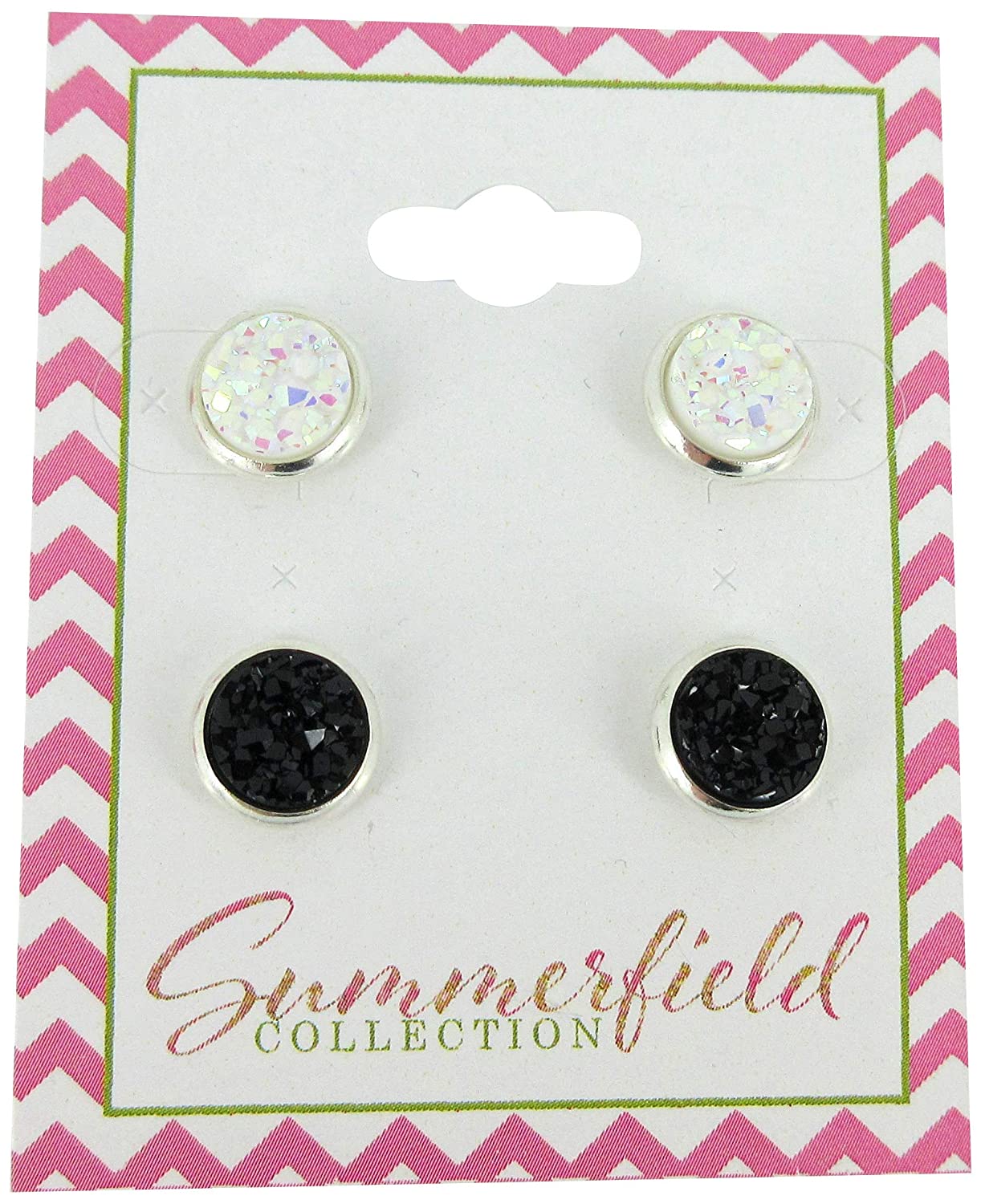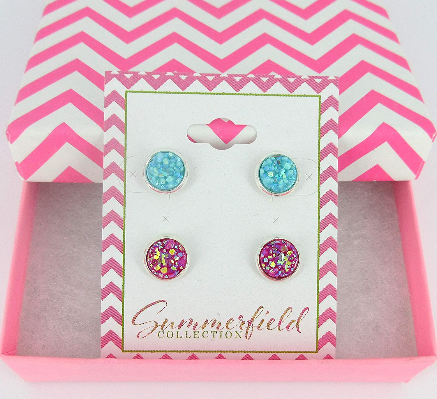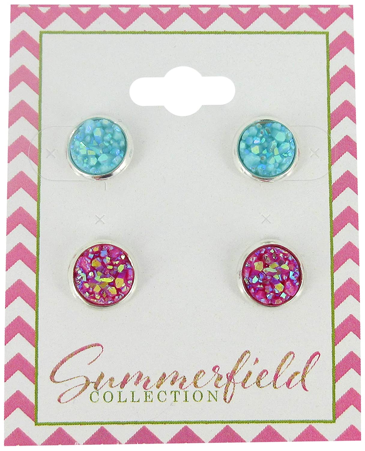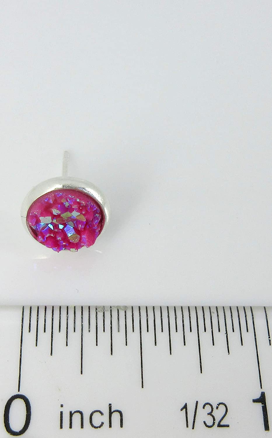 Duo Silver-tone Faux Druzy Stone Stud Earrings 8mm Set (Aqua Blue/Deep Pink AB)