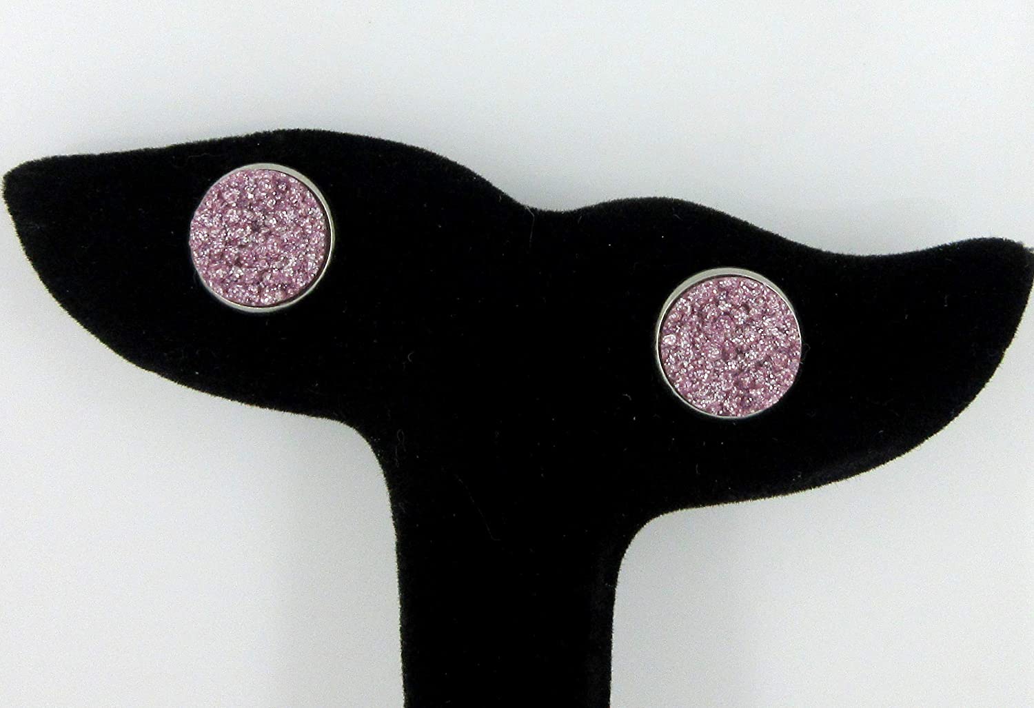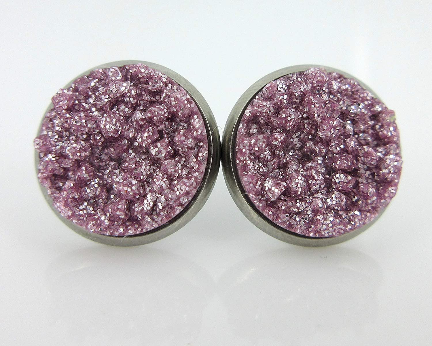 Duo Stud Earrings Stainless Steel Lilac Purple and Aqua Blue Glitter Faux Druzy Stone 12mm Set