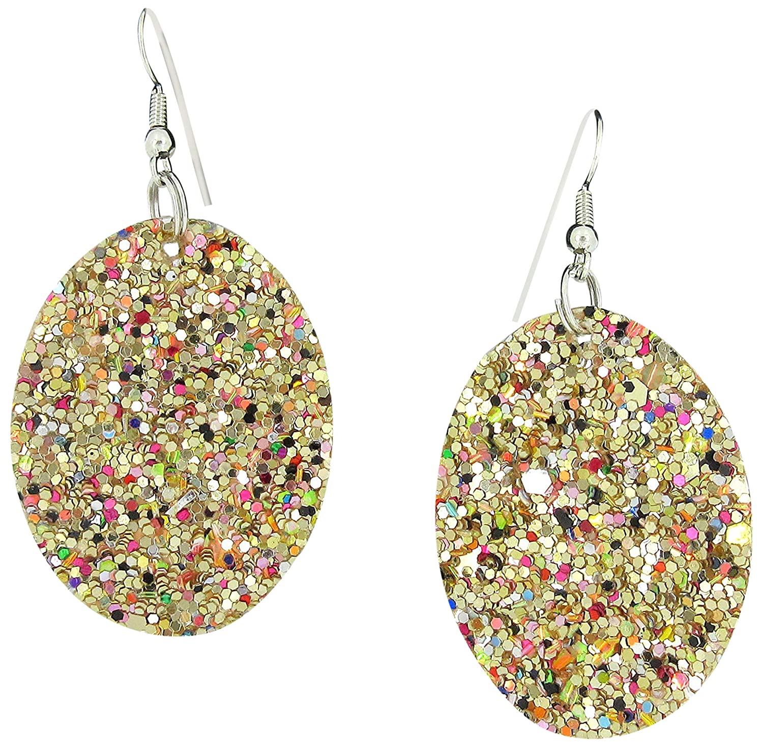 Gold and Rainbow Glitter Faux Leather Oval Dangle Earrings