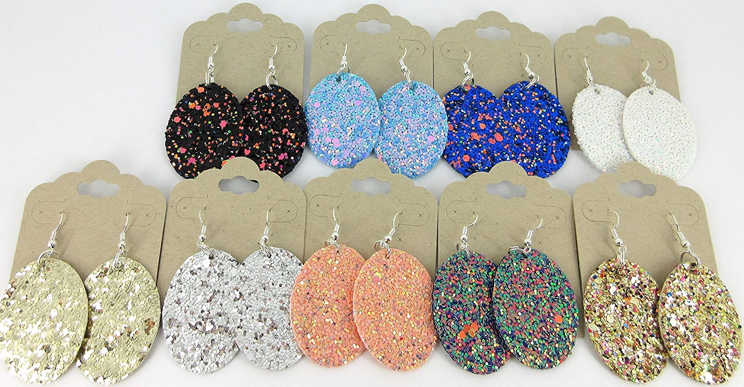 So much fun sparkle! Glitter design is on both sides of these larger statement earrings. Really lightweight. Vegan and faux leather. They are appx. 1.25" W at the largest point. They have a total drop of appx. 2" L. Silver-tone fish hook closure. In stock and ready to ship out. Comes in a gift box for easy gift-giving. They're so unique though, you might be tempted to keep them for yourself!