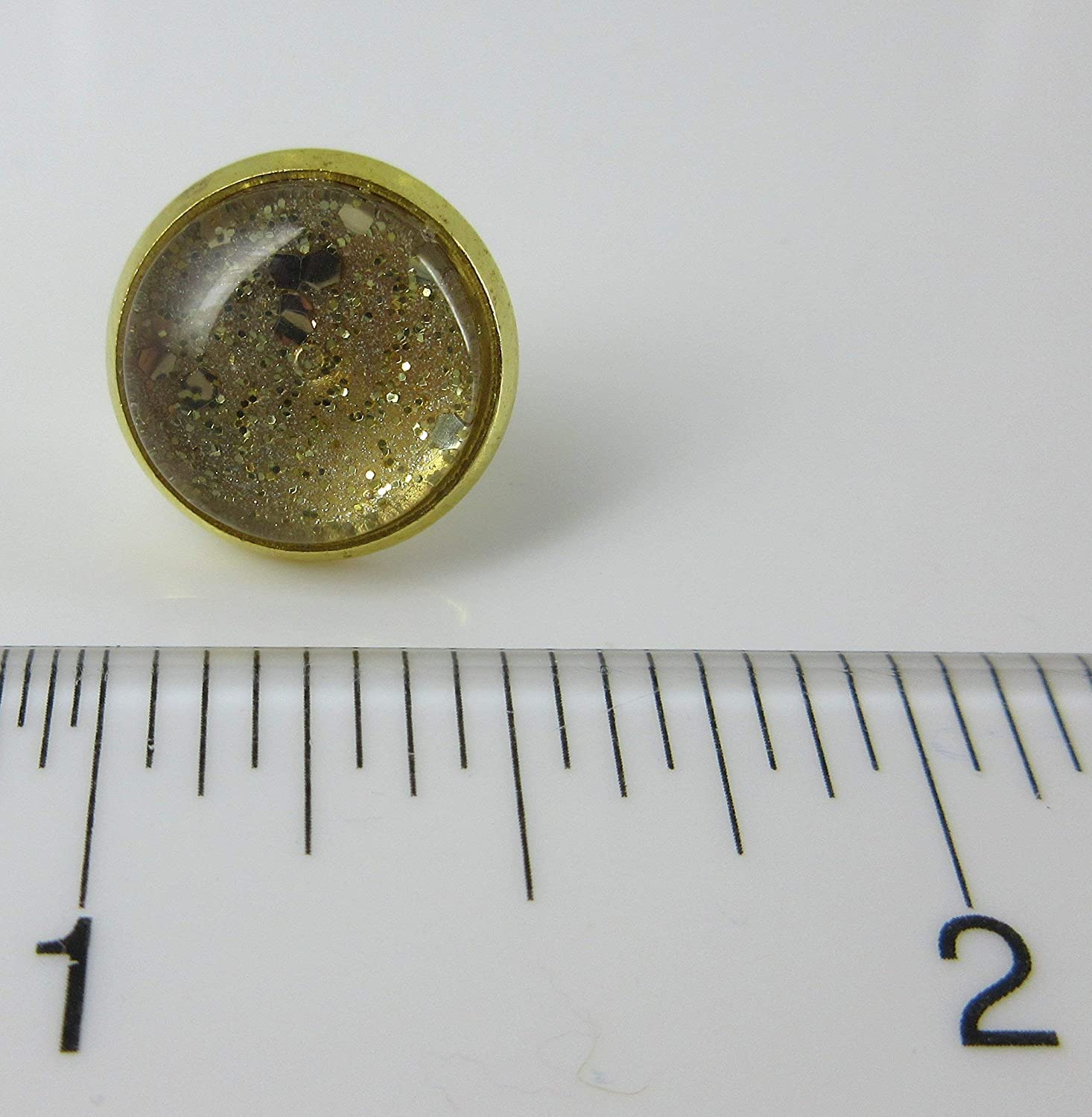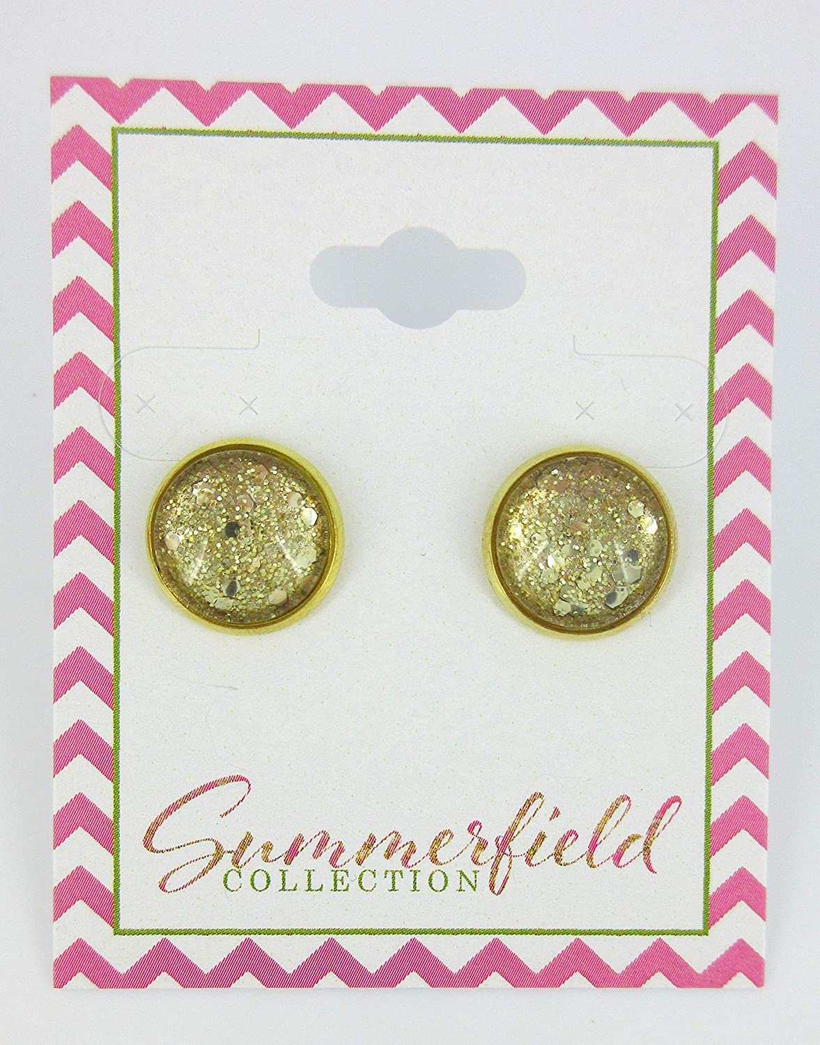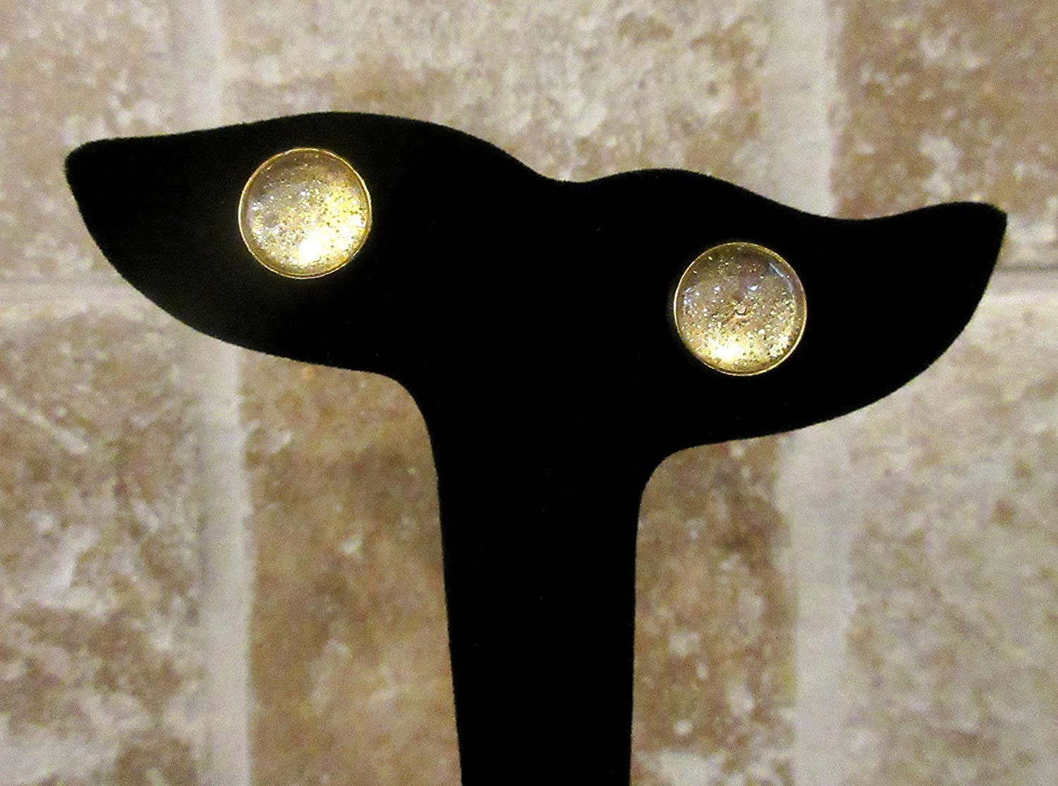 These sparkling glass stud earrings are hand-painted with a metallic gold base color and are topped with coordinating glitter flakes in varying shapes and sizes. The earring diameter is appx. 1/2". Set in a round, shiny, gold-tone bezel setting. In stock and ready to ship out. Comes in a gift box for easy gift-giving. They're so unique though, you might be tempted to keep them for yourself!