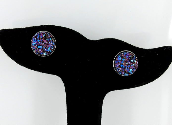Hematite-tone Faux Druzy Stone Stud Earrings 12mm (Purple Pink and Teal)