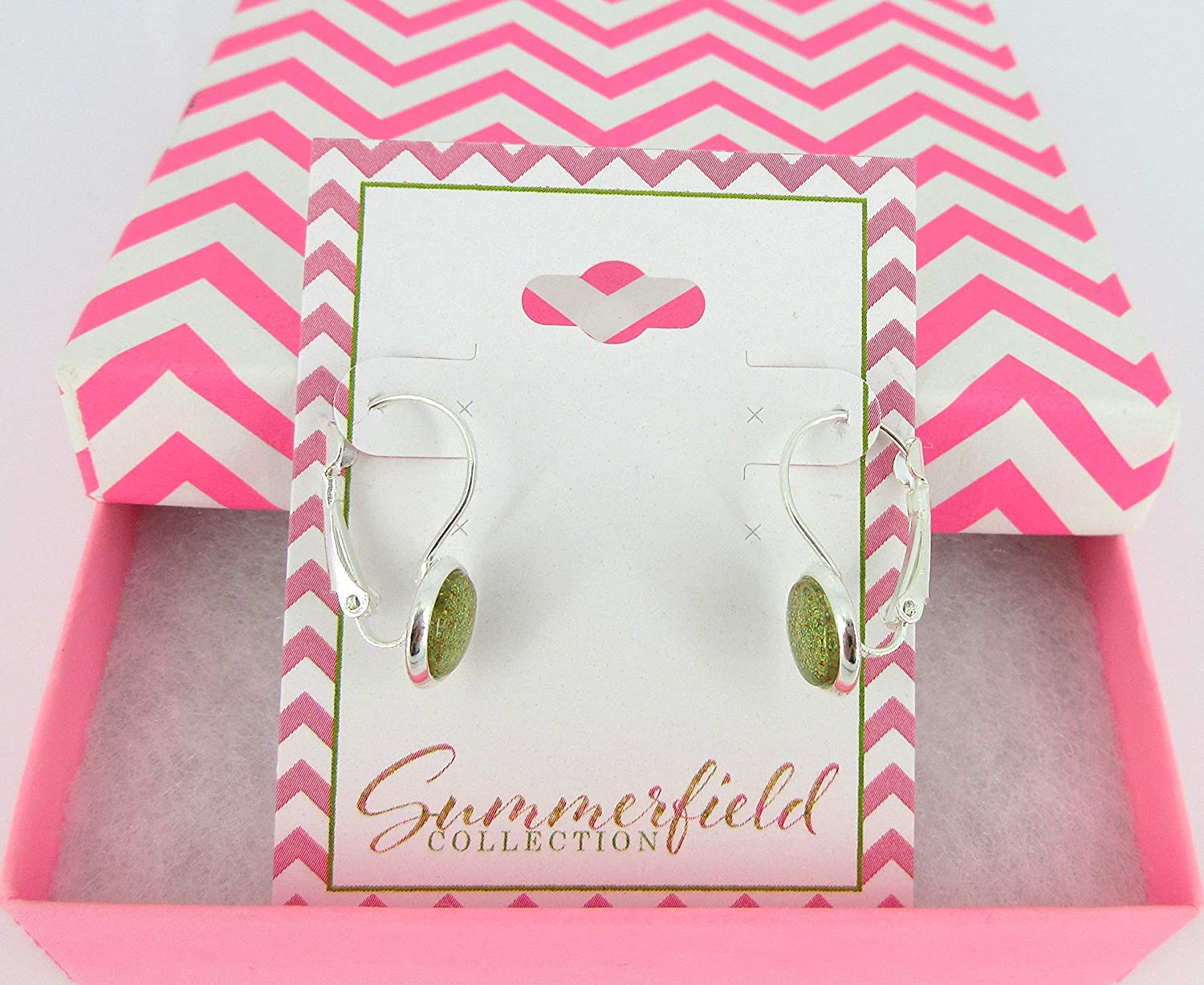 These lightweight glass earrings are painted using various shapes and sizes of color-shifting glitter flakes. Set in a shiny, silver-tone bezel setting. The diameter is appx. 5/16". Total earring drop is appx. 1" L. In stock and ready to ship out. Comes in a gift box for easy gift-giving. They're so unique though, you might be tempted to keep them for yourself!