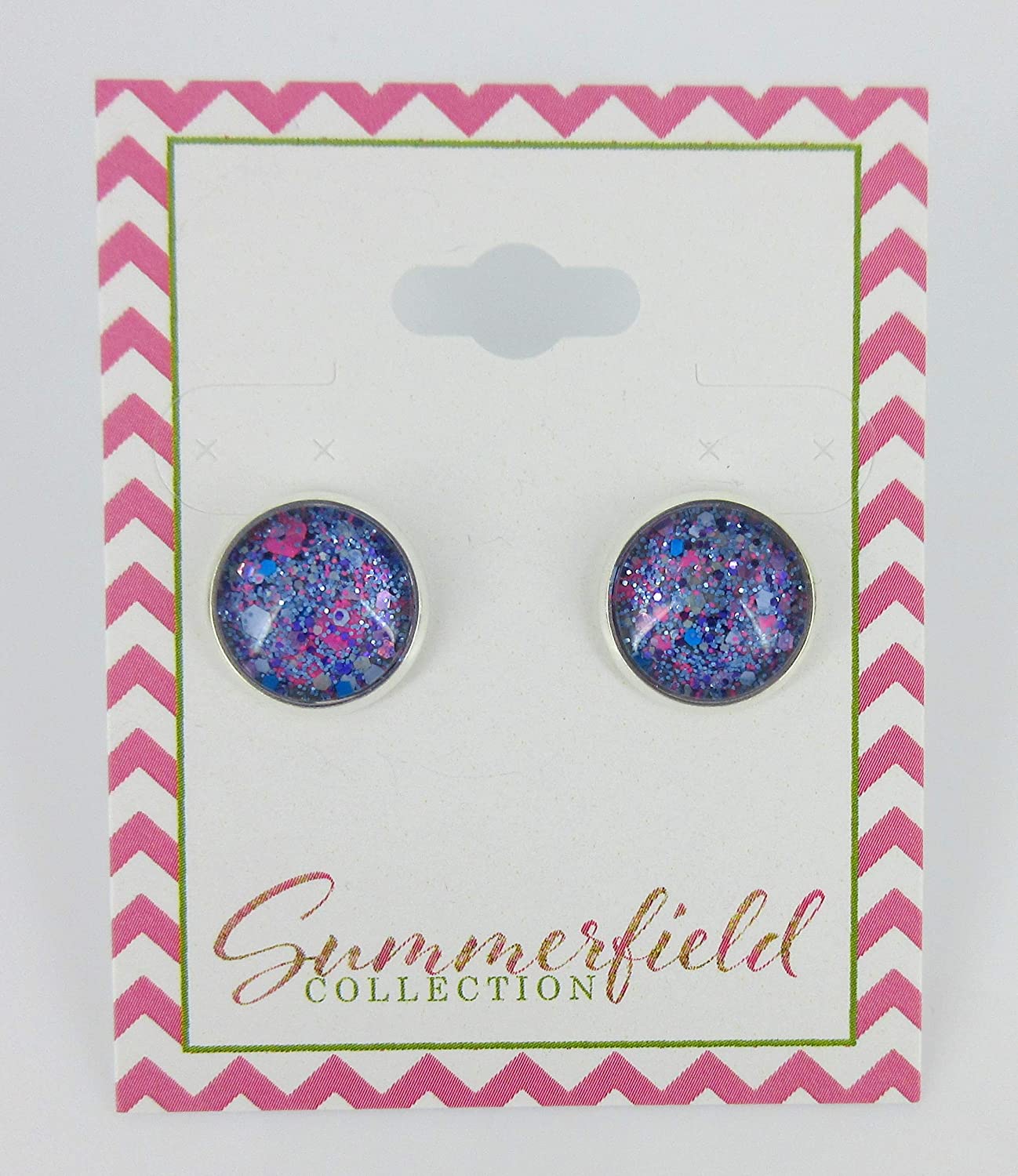 Silver-tone Gray Neon Pink Aqua Blue and Purple Glitter Glass Stud Earrings Hand-painted 12mm