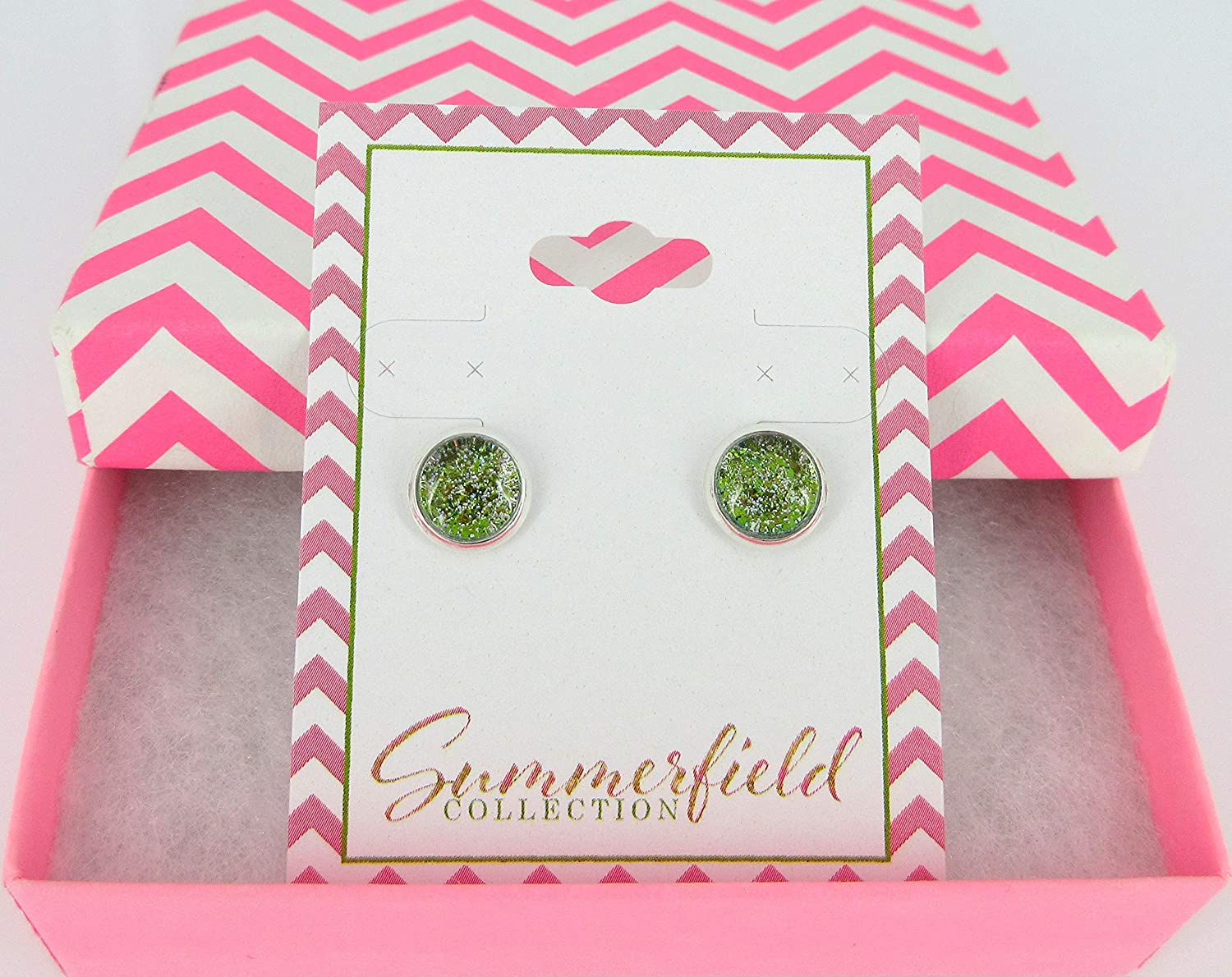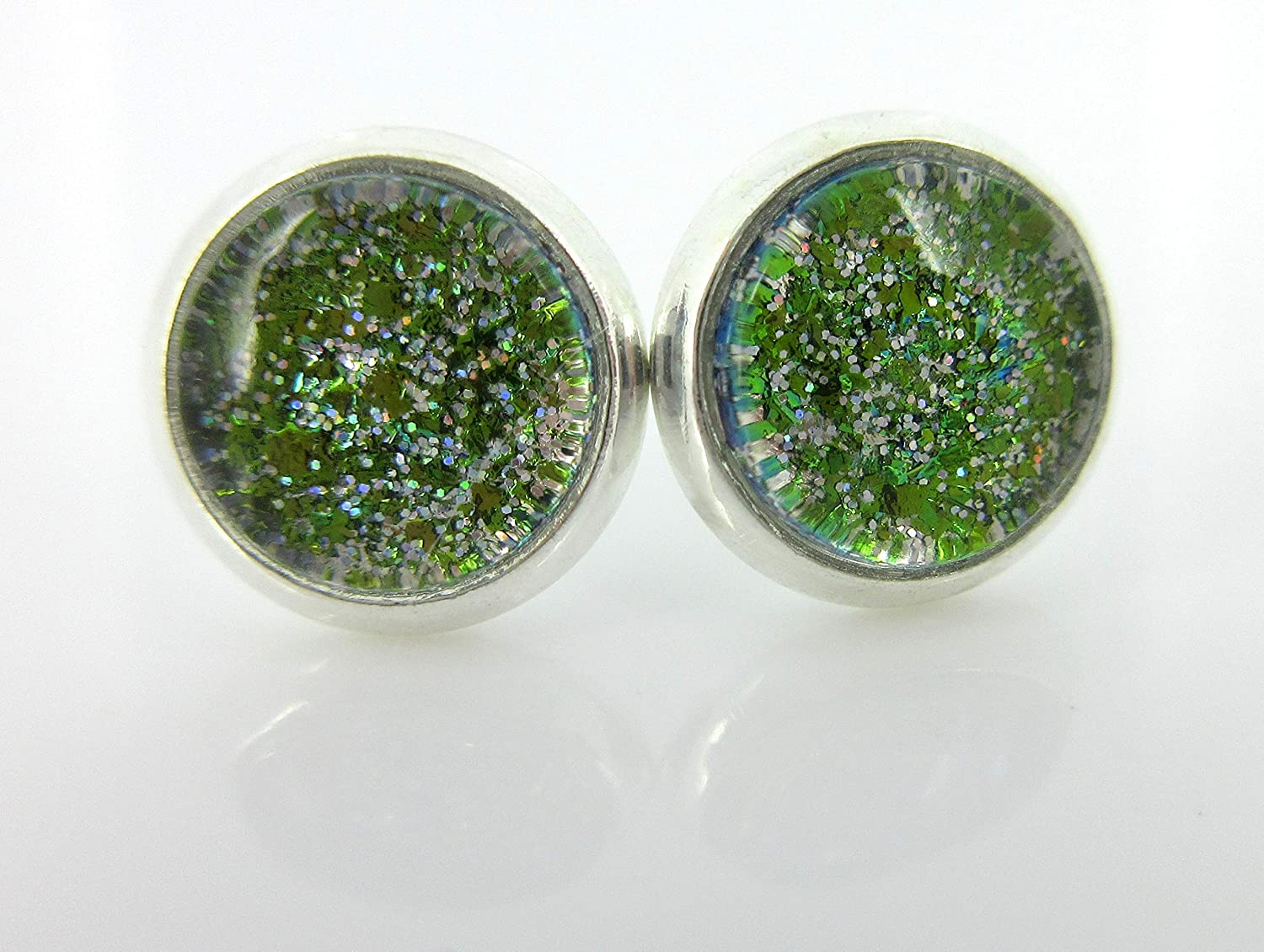 Silver-tone Green Glitter Glass Stud Earrings Hand-painted 8mm