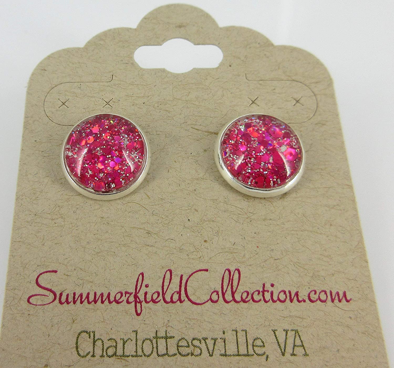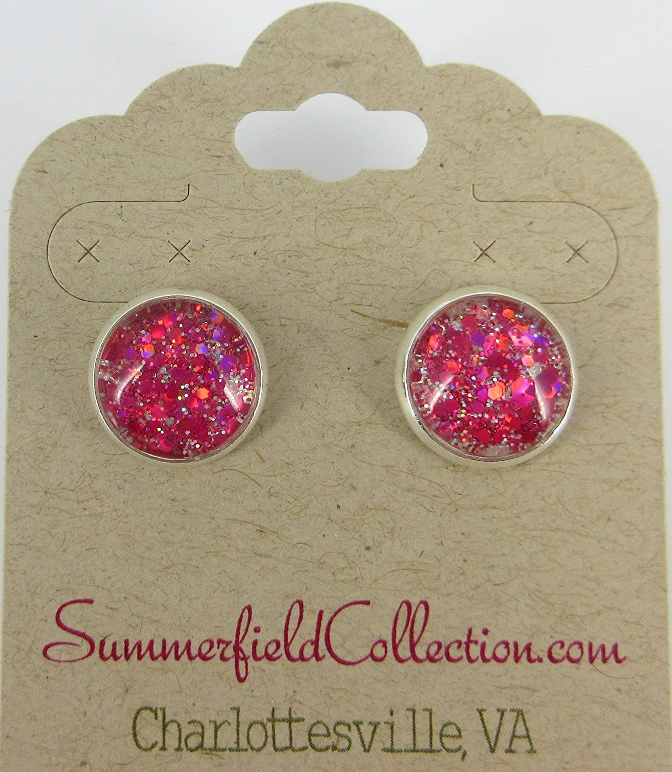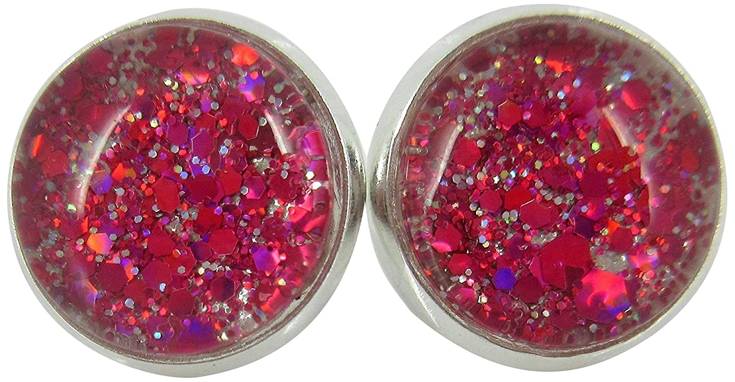 These sparking glass earrings are hand-painted with a pearly white base color and are topped with loads of hot pink and holographic hexagon-shaped glitter in varying sizes. The earring diameter is appx. 1/2". Set in a shiny silver-tone round bezel setting. Post closure. In stock and ready to ship out. Comes in a gift box for easy gift-giving. They're so unique though, you might be tempted to keep them for yourself!