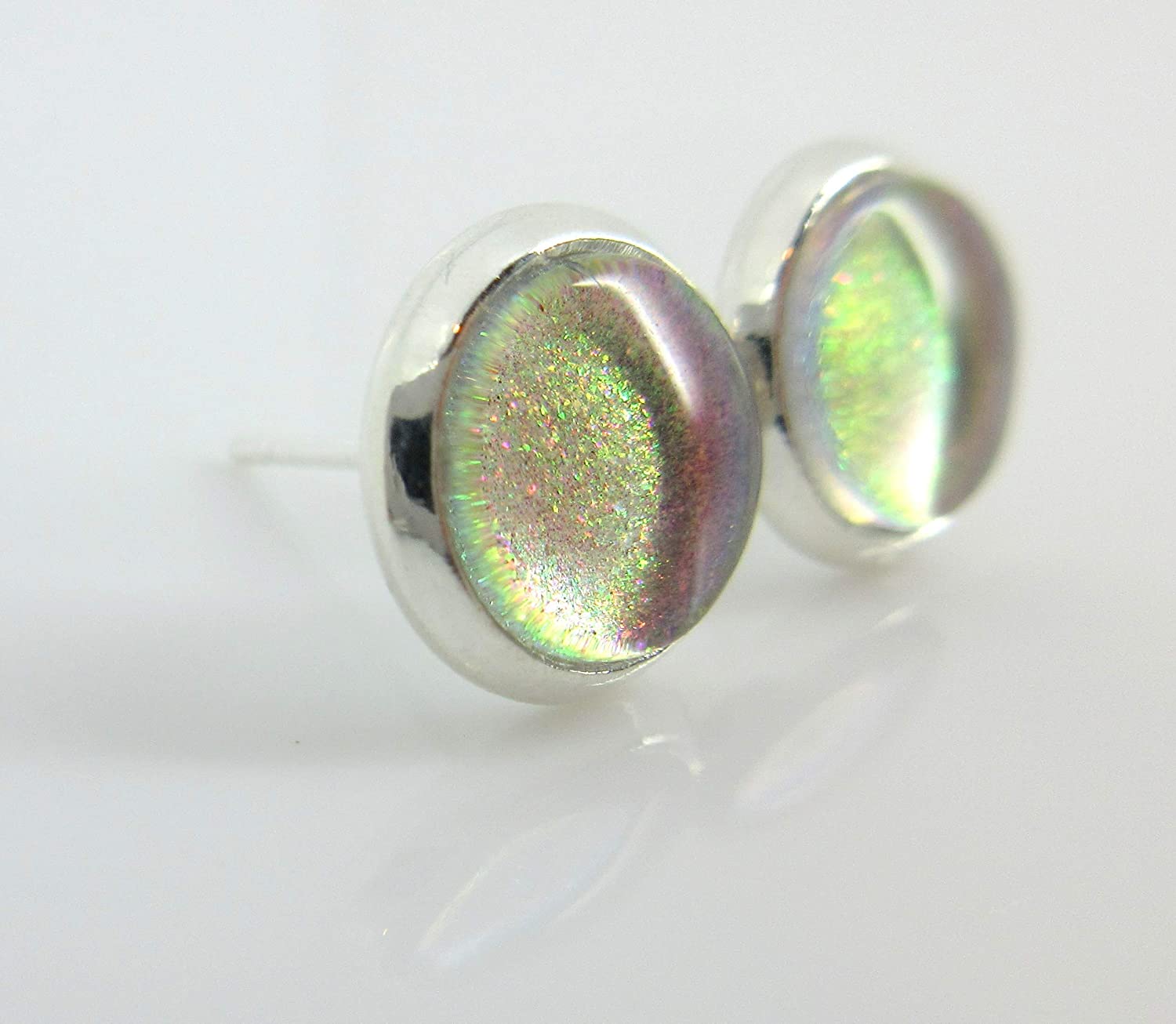These fun glass stud earrings are painted using various shimmery color-shifting glitter flakes. Set in a round, shiny, silver-tone bezel setting. The diameter is appx. 5/16". In stock and ready to ship out. Comes in a gift box for easy gift-giving. They're so unique though, you might be tempted to keep them for yourself!