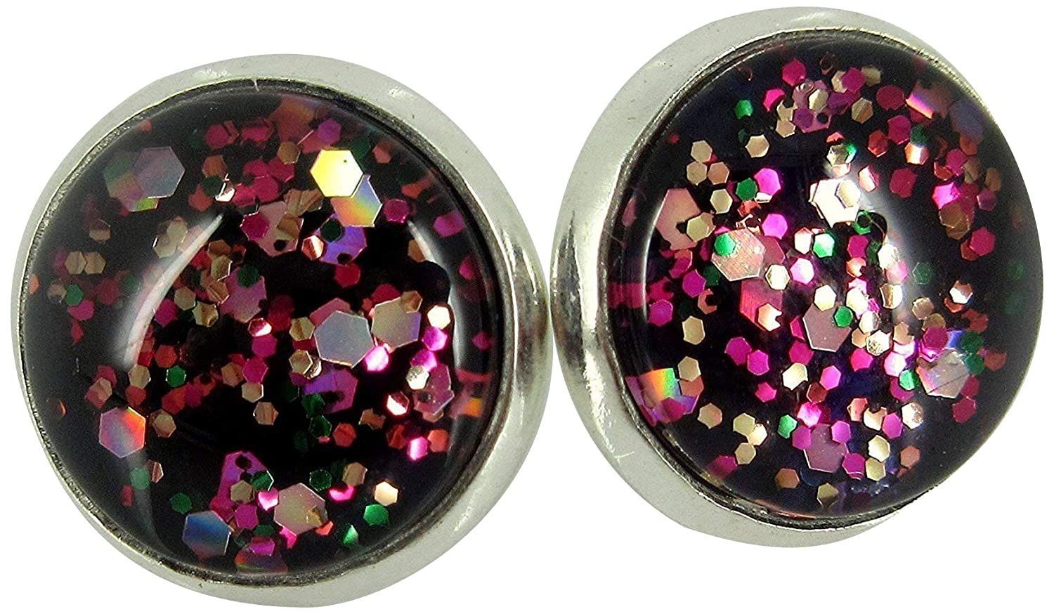 These pretty glass stud earrings are hand-painted with a navy blue base color and are topped with bright pink, kelly green, silver, and holographic hexagon-shaped glitter in varying sizes. The earring diameter is appx. 1/2". Set in a round, shiny, silver-tone bezel setting. In stock and ready to ship out. Comes in a gift box for easy gift-giving. They're so unique though, you might be tempted to keep them for yourself!