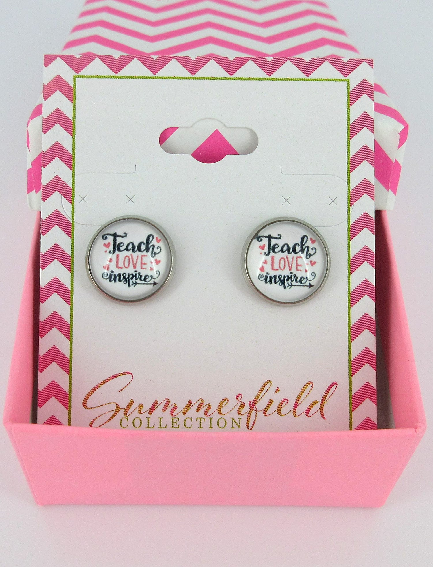 Stainless Steel Teacher Print Glass Stud Earrings 12mm (Teach Love Inspire)