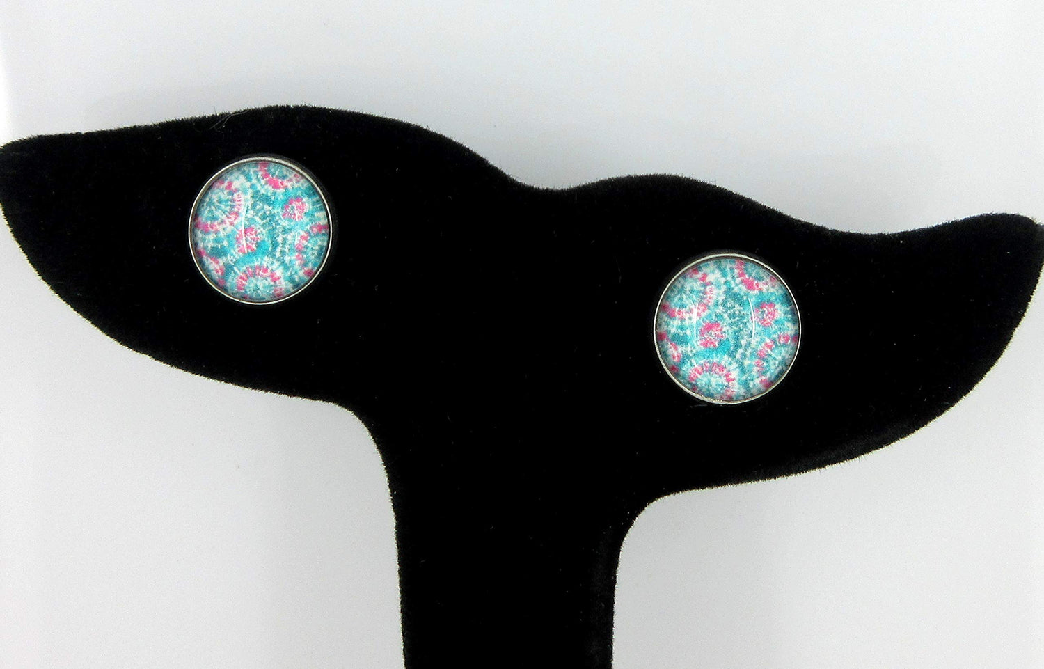 Stainless Steel Tie Dye Print Glass Stud Earrings 12mm (Aqua/Blue/Pink/Green)