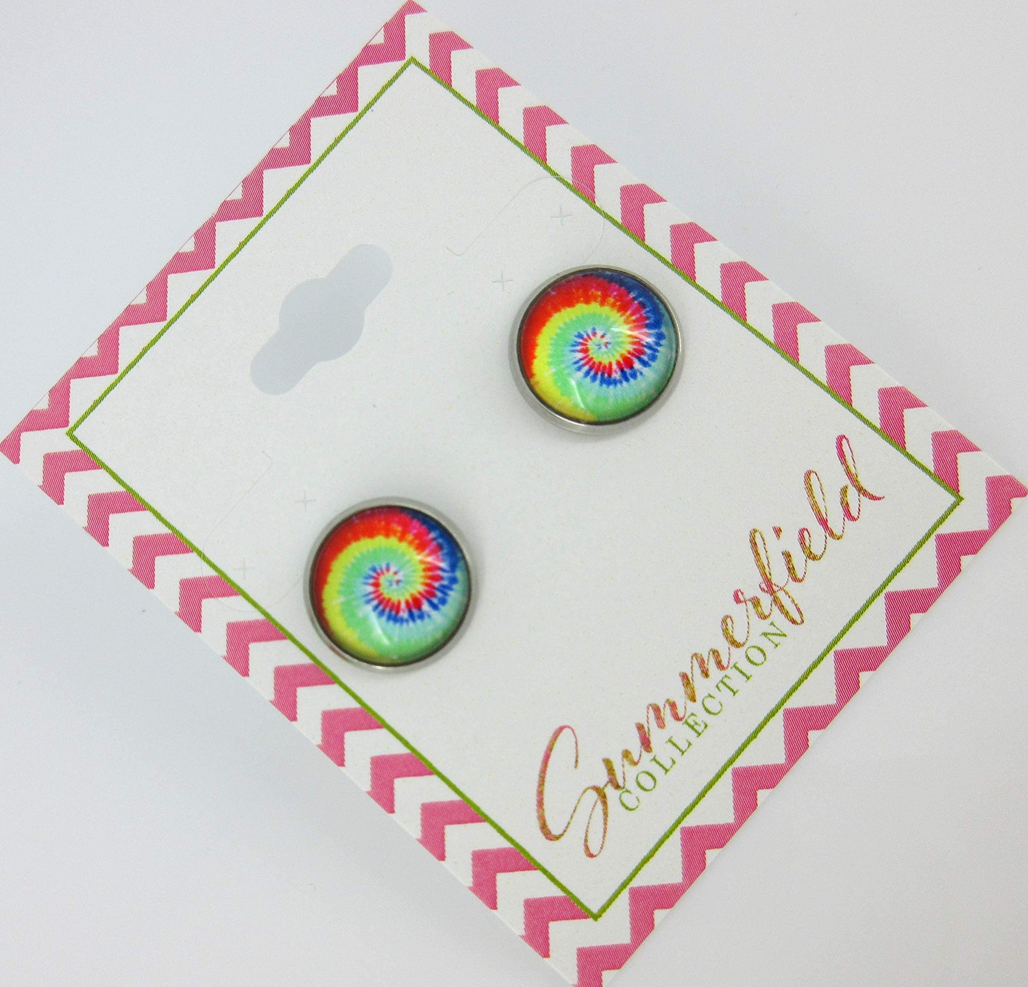 The glass cabochon diameter is appx. 1/2". Set in a round, stainless steel, bezel setting. Hypoallergenic for sensitive ears. In stock and ready to ship out. Comes in a gift box for easy gift-giving. They're so unique though, you might be tempted to keep them for yourself! Nickel, lead and cadmium safe.