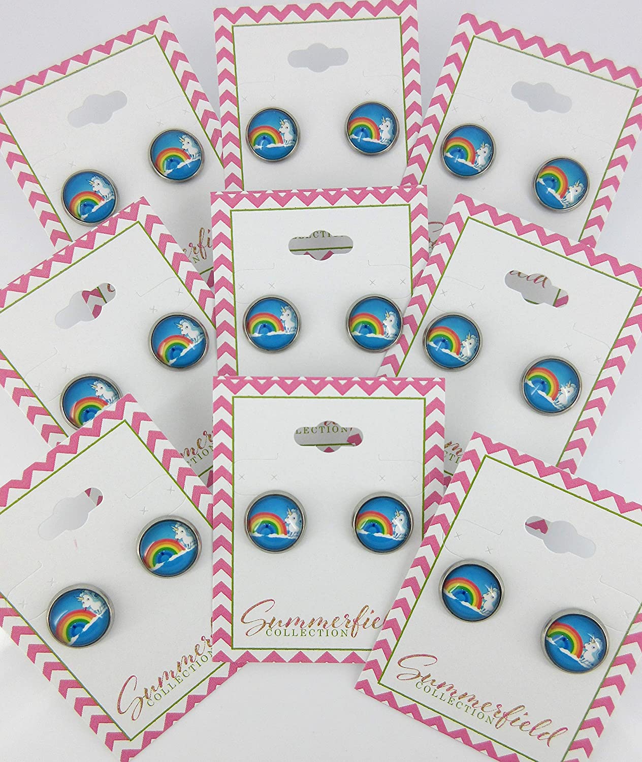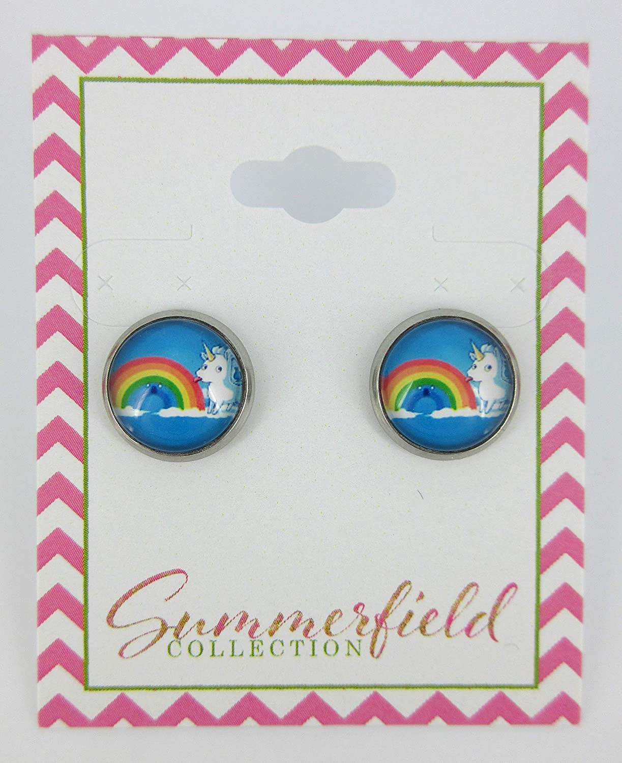 Stainless Steel Unicorn Licking Rainbow Print Glass Stud Earrings 12mm