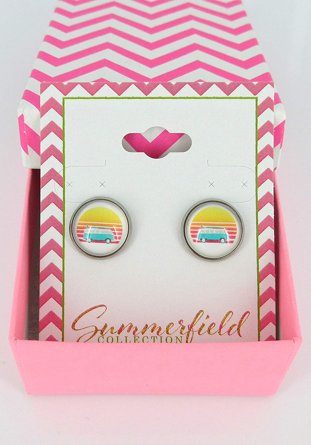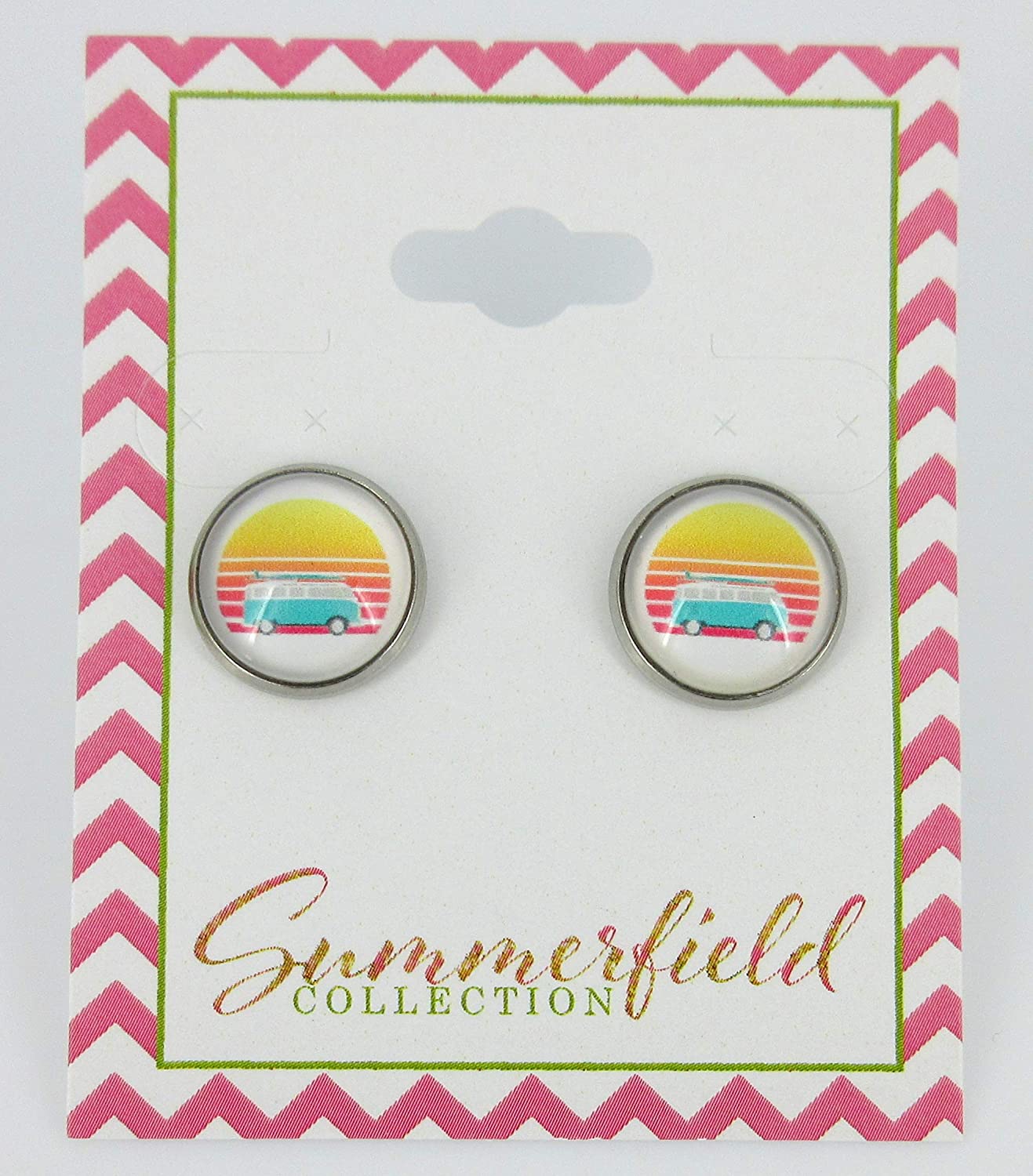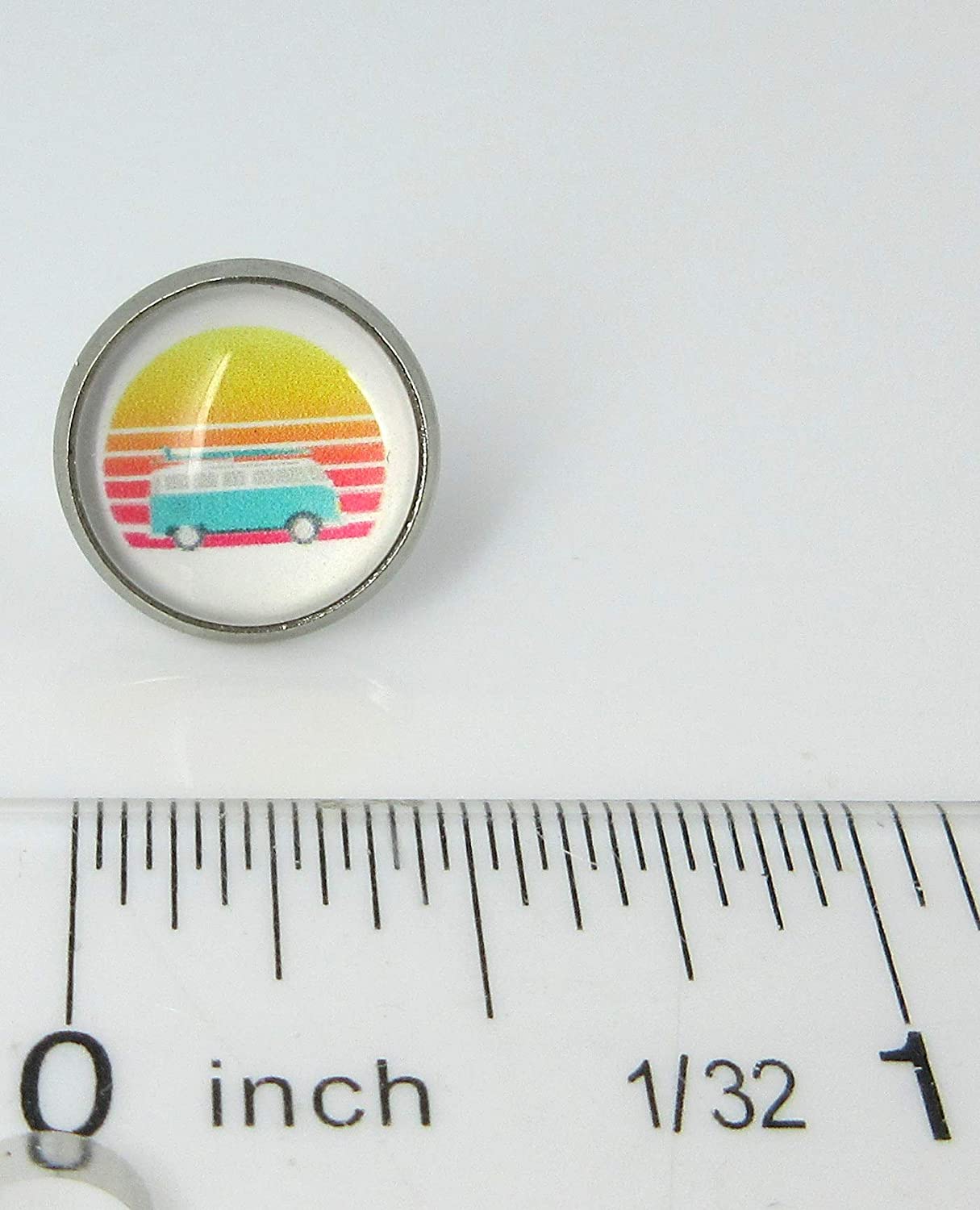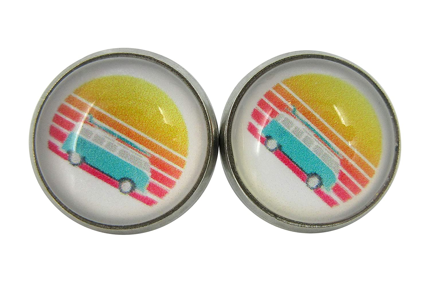 Stainless Steel Vintage Camper Sunset Print Glass Stud Earrings 12mm