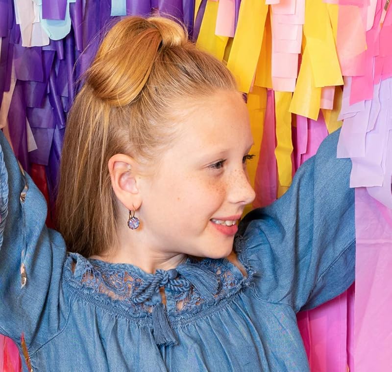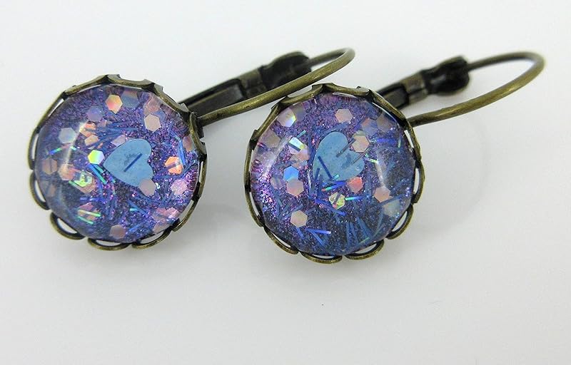 These lightweight glass earrings are so sweet. Hand-painted with a shimmering blue/purple color-shifting base. You'll see holographic hexagons, purple bar, purple heart and flakies in varying sizes. The glass diameter is appx. 1/2". Total earring drop is appx. 1" L. Set in an antiqued gold-tone crown bezel lever-back setting. In stock and ready to ship out. Comes in a gift box for easy gift-giving. They're so unique though, you might be tempted to keep them for yourself!