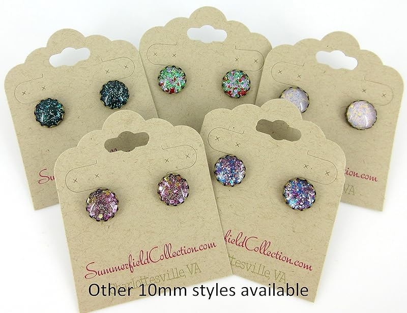 These fun glass stud earrings are hand-painted with a deep teal green color and are topped with holographic silver, green and blue glitter flakes. Set in a round antiqued gold-tone crown bezel setting. The diameter is appx. .40". In stock and ready to ship out. Comes in a gift box for easy gift-giving. They're so unique though, you might be tempted to keep them for yourself!