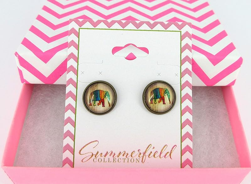 Summerfield Collection Antiqued Gold-tone Rainbow Elephant Print Glass Stud Earrings 12mm