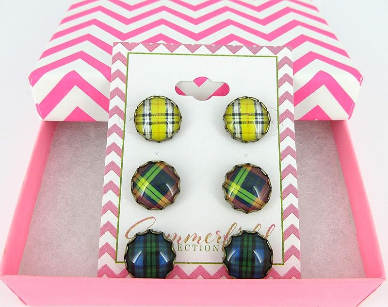 Summerfield Collection Antiqued Gold-tone Trio Plaid Print Glass Stud Earrings 12mm Set