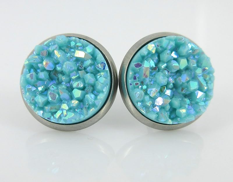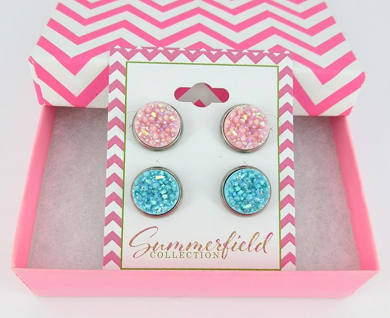 Summerfield Collection Duo Stud Earrings Stainless Steel Faux Druzy Stone 12mm Set (Pink and Blue AB)