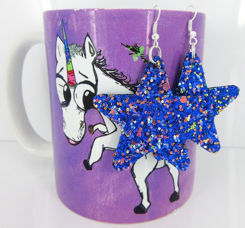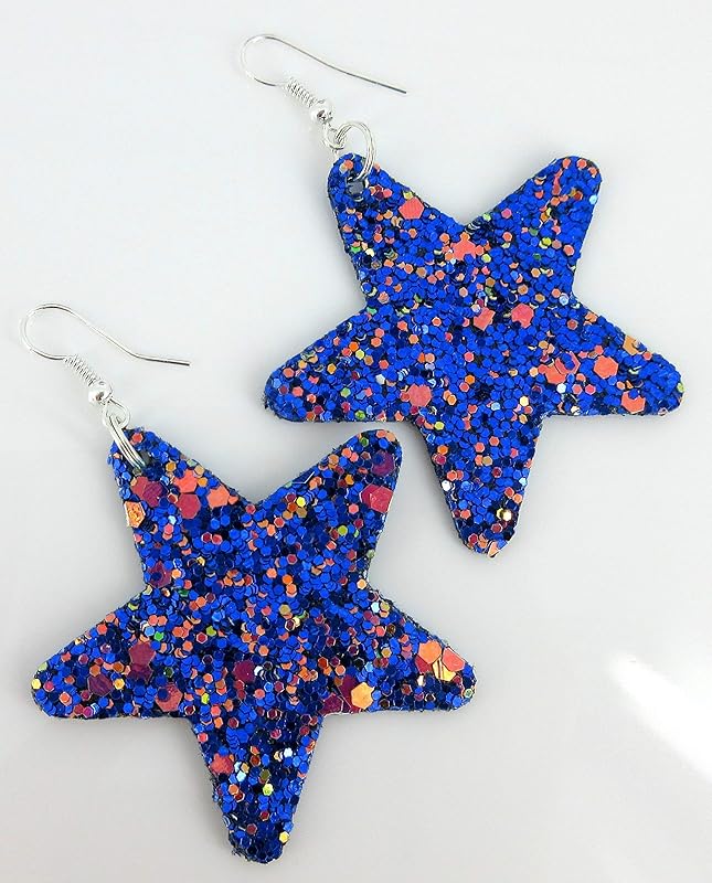 Summerfield Collection Glitter Faux Leather Large Star Dangle Earrings (Blue with Pink and Black)