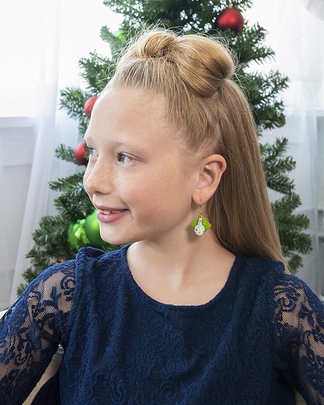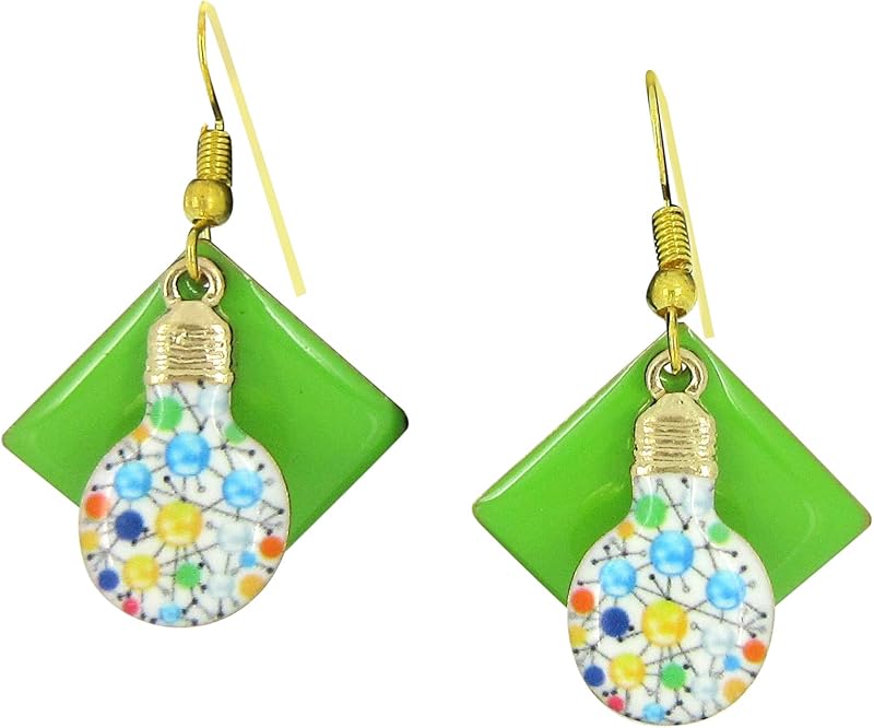 These fun earrings have a 1" W enamel geometric shape. On top are cute multi-color light bulb charms. Total earring drop is appx. 1.75" L. Fish hook closure. In stock and ready to ship out. Comes in a gift box for easy gift-giving. They're so unique though, you might be tempted to keep them for yourself!