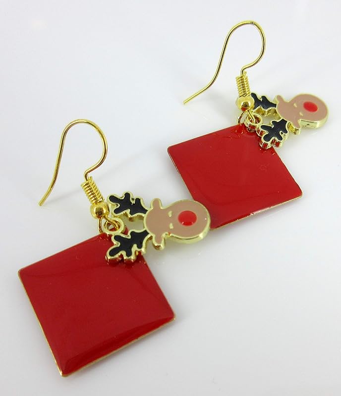 These fun earrings have a 1" W red enamel geometric shape. On top are cute reindeer charms. Total earring drop is appx. 1.75" L. Fish hook closure. In stock and ready to ship out. Comes in a gift box for easy gift-giving. They're so unique though, you might be tempted to keep them for yourself!