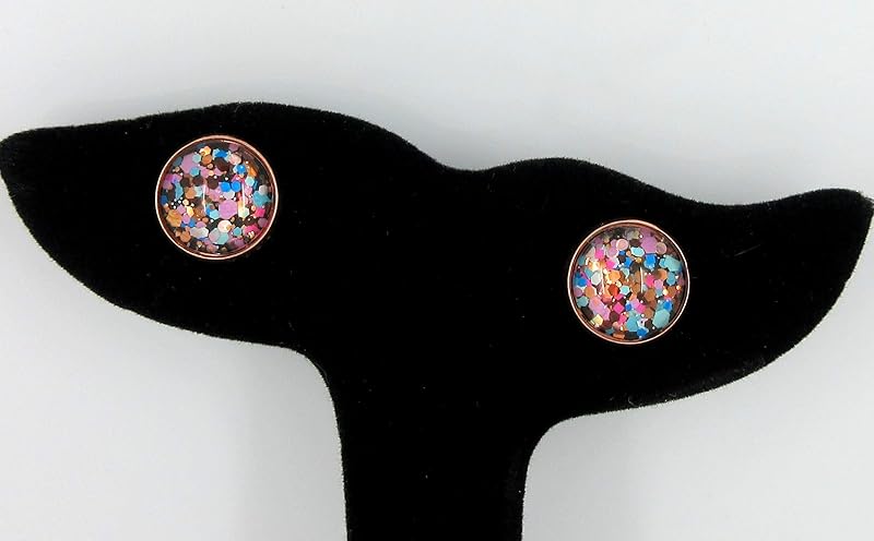 These fun glass stud earrings are hand-painted with a metallic black base color and are topped with lots of chunky glitter: Multi sized metallic rose, copper, bronze, matte neon pink, light blue, aqua blue hexagons and dots. The diameter is appx. 1/2". Set in a round, shiny, rose gold-tone bezel setting. In stock and ready to ship out. Comes in a gift box for easy gift-giving. They're so unique though, you might be tempted to keep them for yourself!