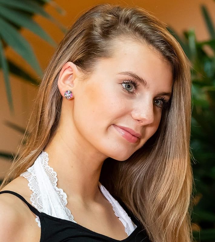 Summerfield Collection Rose Gold-tone Blue Pink Purple Glitter Glass Stud Earrings 12mm Hand-painted