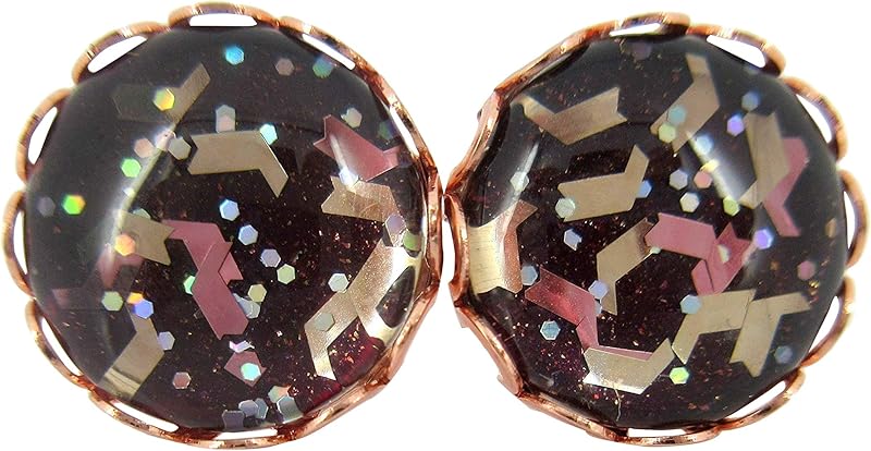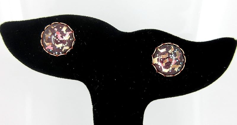 These fun glass stud earrings are hand-painted with a metallic burgundy base color and are topped with lots of chunky glitter: Metallic copper and gold chevron flakes and tiny holographic dots. The diameter is appx. 1/2". Set in a round, shiny, rose gold-tone crown bezel setting. In stock and ready to ship out. Comes in a gift box for easy gift-giving. They're so unique though, you might be tempted to keep them for yourself!