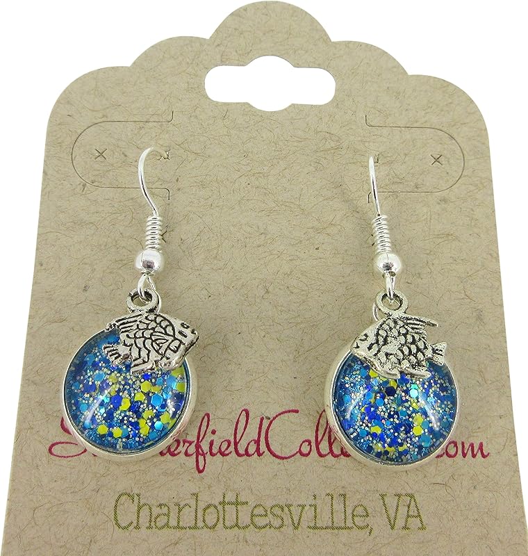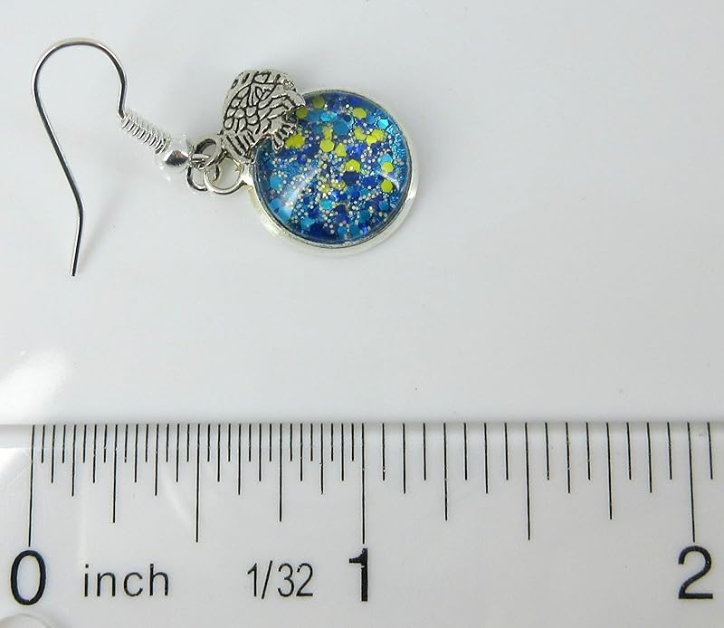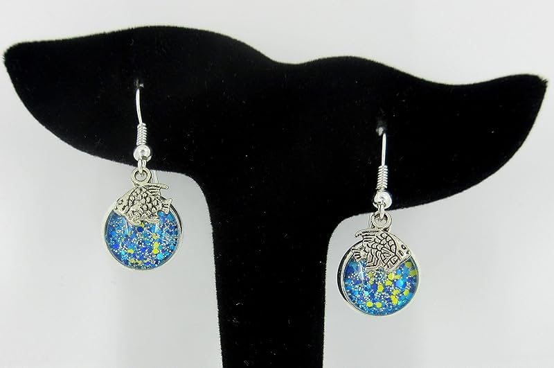 These sparkly glass earrings are hand-painted with a deep blue base color and are topped with loads of blue, yellow and silver glitter flakes. They feature tropical fish charms. These earrings are lightweight and fun! The glass diameter is appx. 1/2". Total earring drop is appx. 1 3/8" L. Set in a shiny silver-tone bezel setting. Fish hook closure. In stock and ready to ship out. Comes in a gift box for easy gift-giving. They're so unique though, you might be tempted to keep them for yourself!