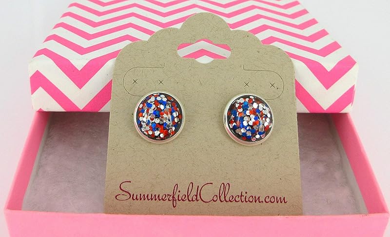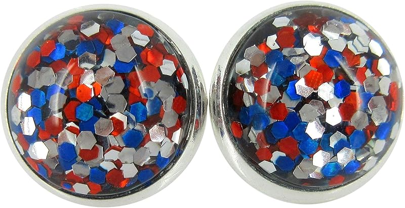 Summerfield Collection Silver-tone Patriotic Glitter Resin Stud Earrings Red Blue USA (12mm)