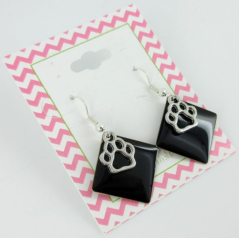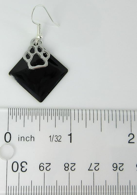 These fun earrings have a 1" W enamel geometric shape. On top are small paw print charms. Total earring drop is appx. 1.5" L. Fish hook closure. In stock and ready to ship out. Comes in a gift box for easy gift-giving. They're so unique though, you might be tempted to keep them for yourself!