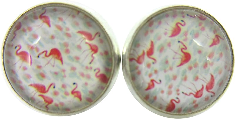 Summerfield Collection Silver-tone White Pink and Blue Flamingo Print Glass Stud Earrings 12mm