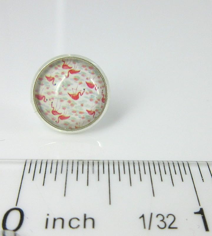 These earrings are so fun! The print looks like confetti, but they're actually little tiny flamingo shapes! The glass cabochon diameter is appx. 1/2". Set in a shiny silver-tone bezel setting. Post closure. In stock and ready to ship out. Comes in a gift box for easy gift-giving. They're so unique though, you might be tempted to keep them for yourself!