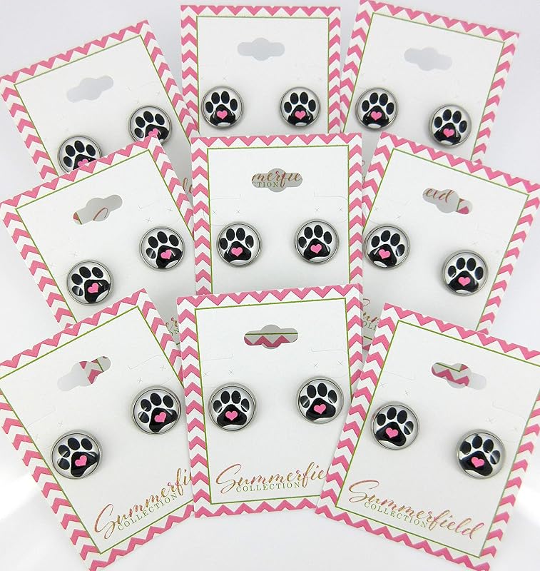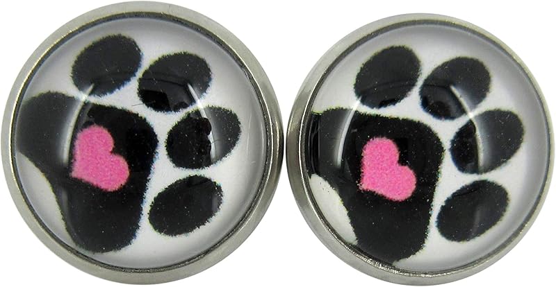Summerfield Collection Stainless Steel Black and White Paw Print Pink Heart Glass Stud Earrings 12mm