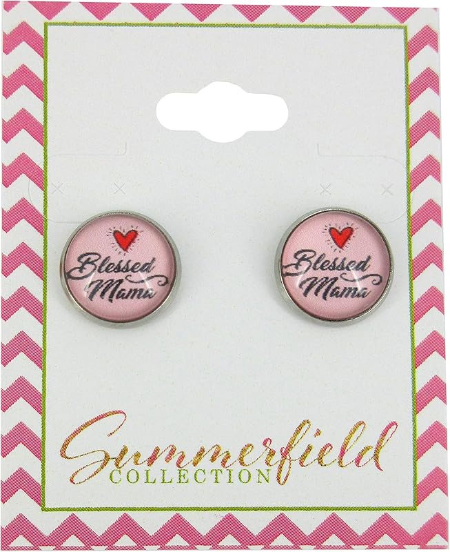 Summerfield Collection Stainless Steel Blessed Mama Print Glass Stud Earrings 12mm