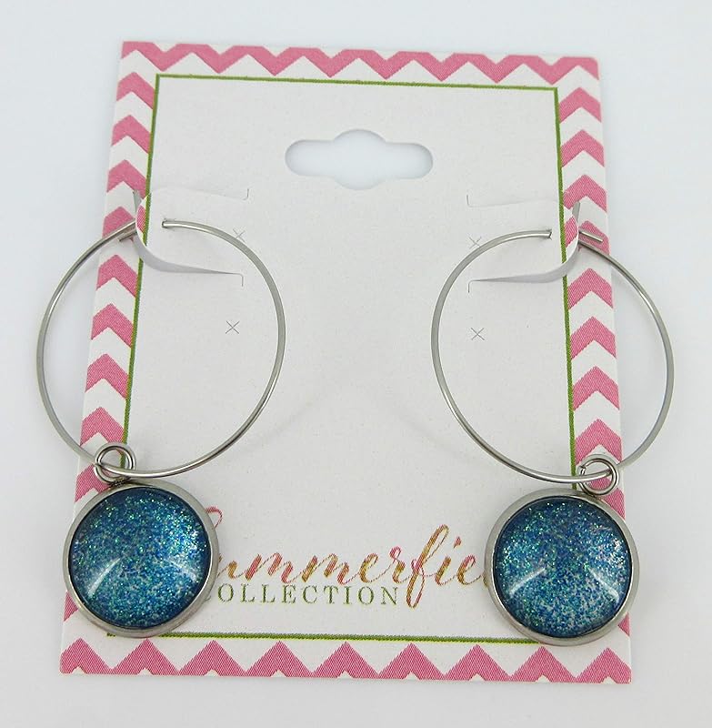 Summerfield Collection Stainless Steel Blue Green Glitter Glass Charm Hoop Earrings Hand-painted 1"