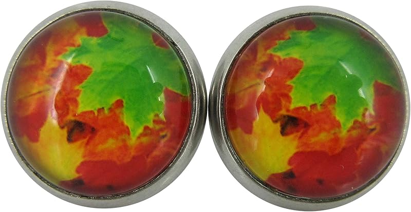 Summerfield Collection Stainless Steel Fall Leaves Green Orange Yellow Print Glass Stud Earrings 12mm