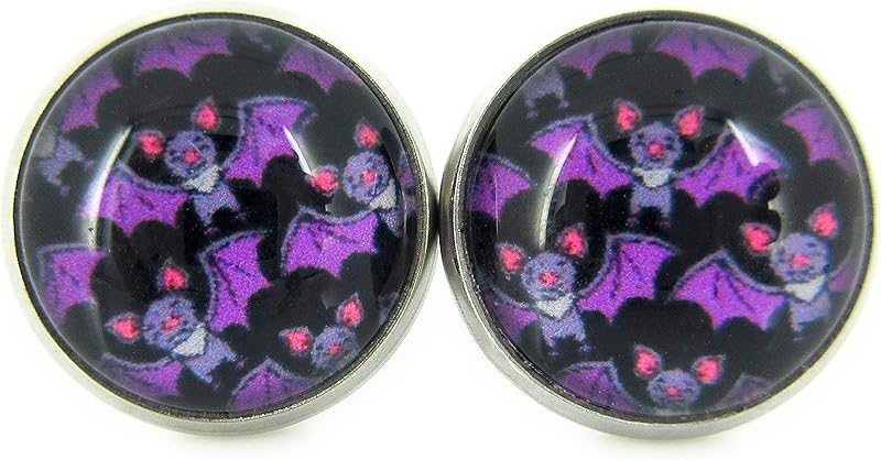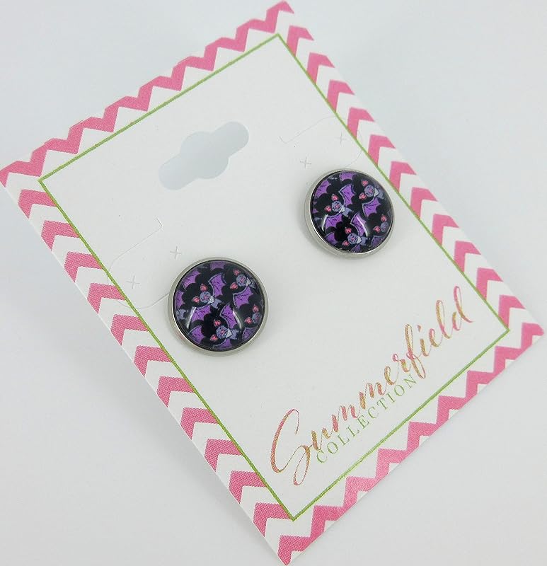 Summerfield Collection Stainless Steel Halloween Printed Glass Stud Earrings 12mm (Purple Bat)