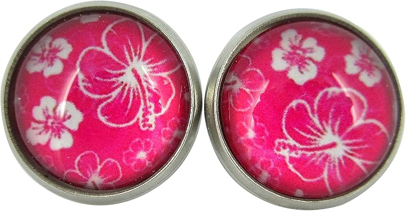 Summerfield Collection Stainless Steel Hibiscus Flower Print Glass Stud Earrings 12mm Hawaiian (Hot Pink)