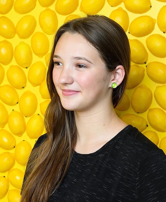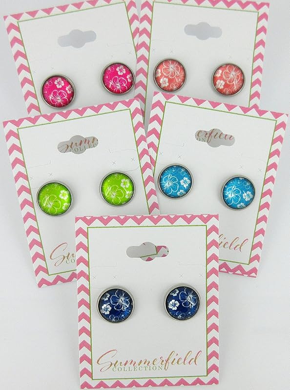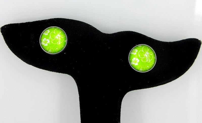 Summerfield Collection Stainless Steel Hibiscus Flower Print Glass Stud Earrings 12mm Hawaiian (Lime Green)