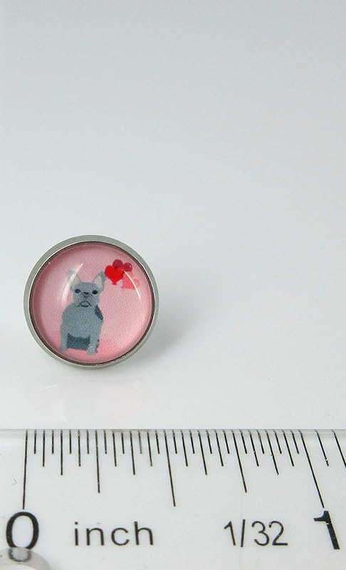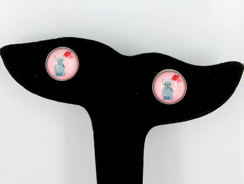 Summerfield Collection Stainless Steel Pink Gray French Bulldog Hearts Print Glass Stud Earrings 12mm