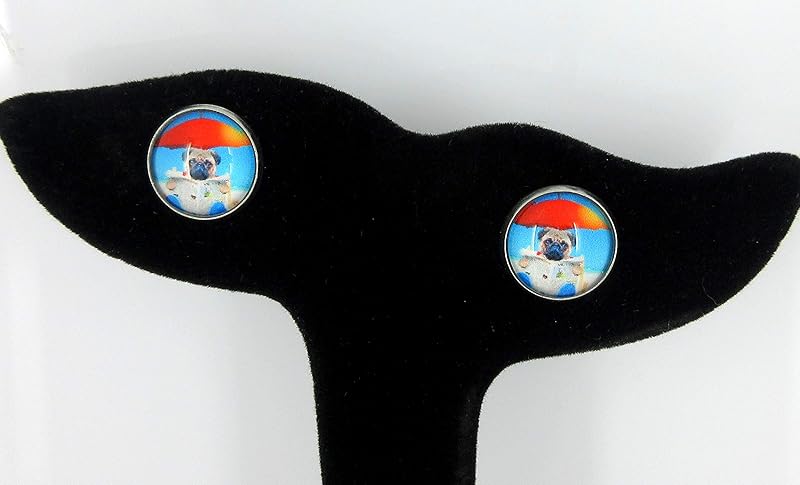 Summerfield Collection Stainless Steel Pug Dog on the Beach Print Glass Stud Earrings 12mm