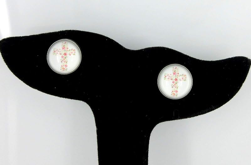 Summerfield Collection Stainless Steel White and Pink Flower Cross Print Glass Stud Earrings 12mm