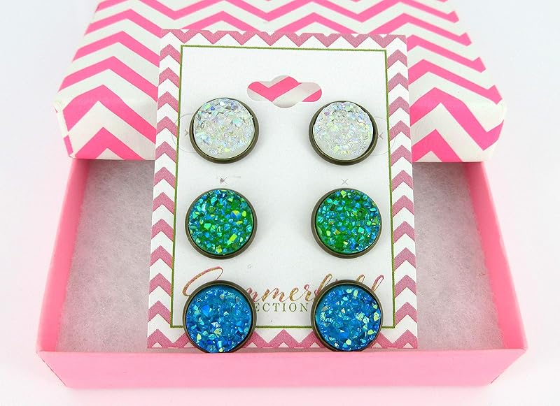 Summerfield Collection Trio Antiqued Gold-tone Stud Earrings Faux Druzy Stone Clear AB Sea Blue Green Set 12mm