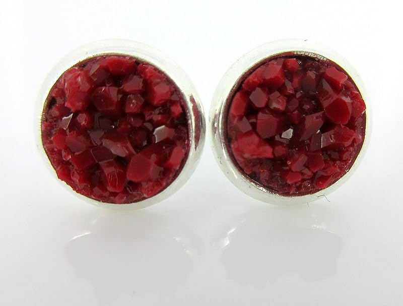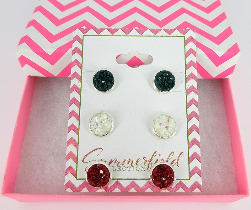 Summerfield Collection Trio Silver-tone Stud Earrings 8mm Faux Druzy Stone Set (Red/White AB/Green)