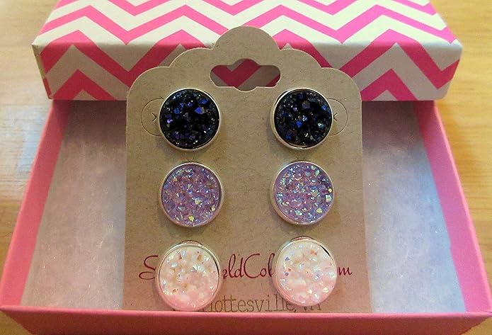 Trio Silver-tone Stud Earrings Faux Druzy Stone Midnight Blue Lavender AB White Set 12mm